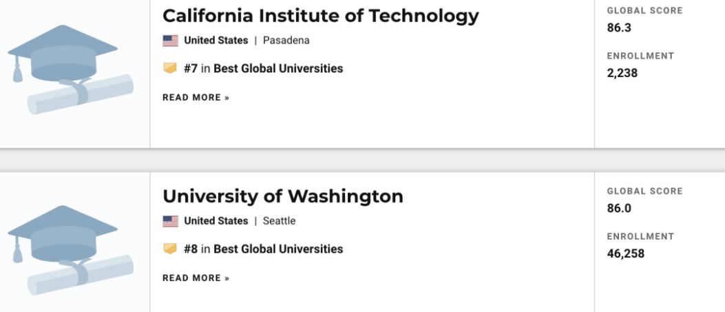 進入世界前十名的大學還有:加州大學伯克利分校(第四名)、牛津大學(第五名)、哥倫比亞大學(第六名)、加州理工學院(第七名)、華盛頓大學(第八名)、劍橋大學(第九名)以及約翰斯·霍普金斯大學(第十名)。根據榜單,前十名中除了來自英國的牛津大學和劍橋大學,其他學校均為美國院校。