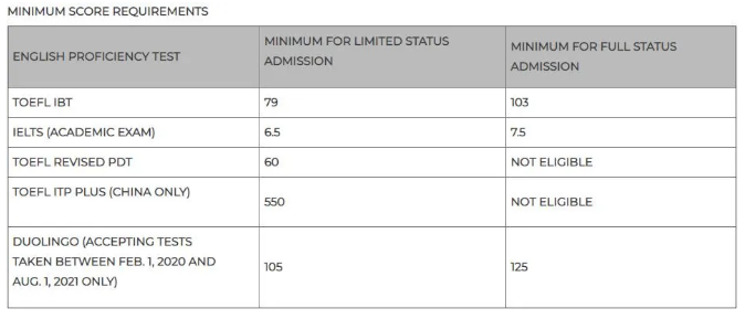 最低分數要求為——托福:79分;雅思:6.5分;托福ITP:550分;