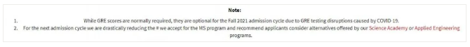 1. 受疫情影響,學校表示2021年秋季入學周期中申請者可以不提交GRE成績(之前說明GRE要求的地方也被劃線表示作廢)。