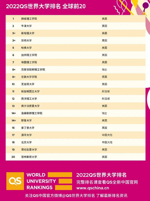 最新!2022年QS世界大學排名發布,MIT全球第一!清華北大擠進前20!